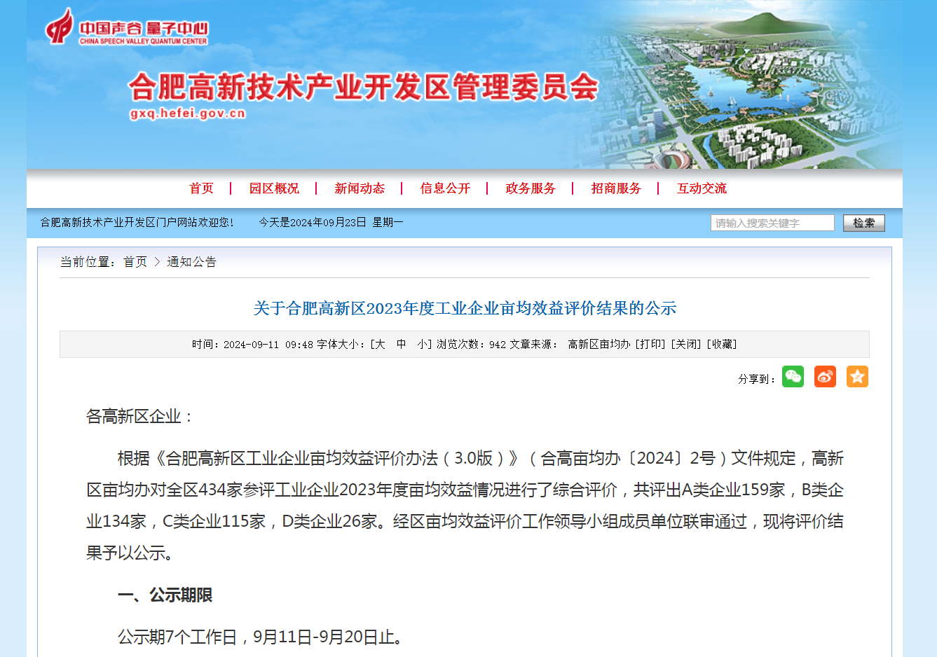 根據(jù)《合肥高新區(qū)工業(yè)企業(yè)畝均效益評(píng)價(jià)辦法(3.0版)》(合高畝均辦〔2024〕2號(hào))文件規(guī)定,高新區(qū)畝均辦對(duì)全區(qū)434家參評(píng)工業(yè)企業(yè)2023年度畝均效益情況進(jìn)行了綜合評(píng)價(jià),共評(píng)出A類企業(yè)159家,B類企業(yè)134家,C類企業(yè)115家,D類企業(yè)26家。經(jīng)區(qū)畝均效益評(píng)價(jià)工作領(lǐng)導(dǎo)小組成員單位聯(lián)審?fù)ㄟ^,近期對(duì)評(píng)價(jià)結(jié)果予以了公示。